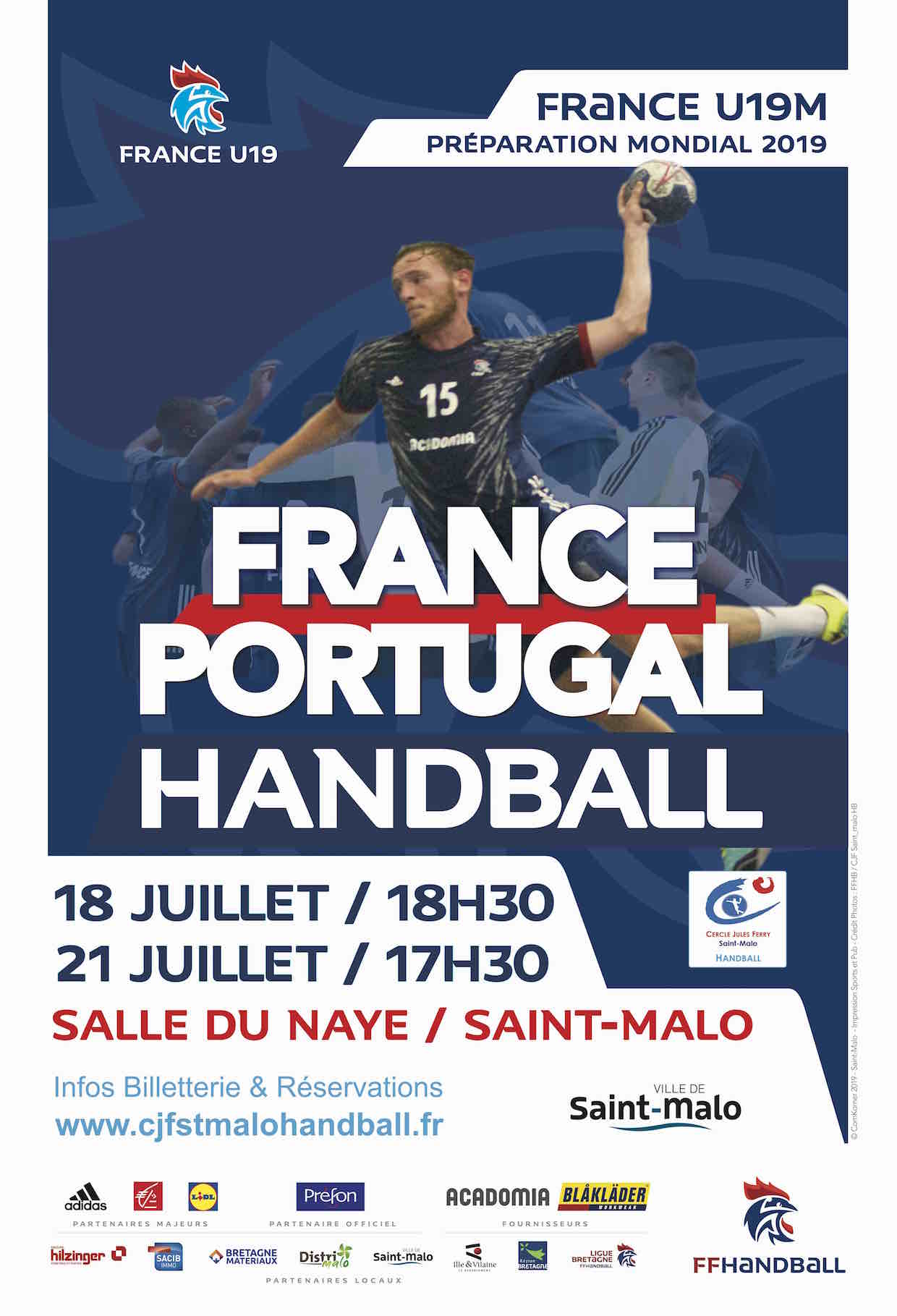 Pour la 7ème année consécutive, le Cercle Jules Ferry Saint-Malo Handball accueillera la délégation française U18/U19 masculine de handball, associée à la délégation portugaise masculine de cette même catégorie d’âge, afin qu’elles puissent préparer sereinement l’ échéance internationale de l’année 2019 : les Championnats du Monde U19 (Macédoine – du 5 au 18 août 2019)
