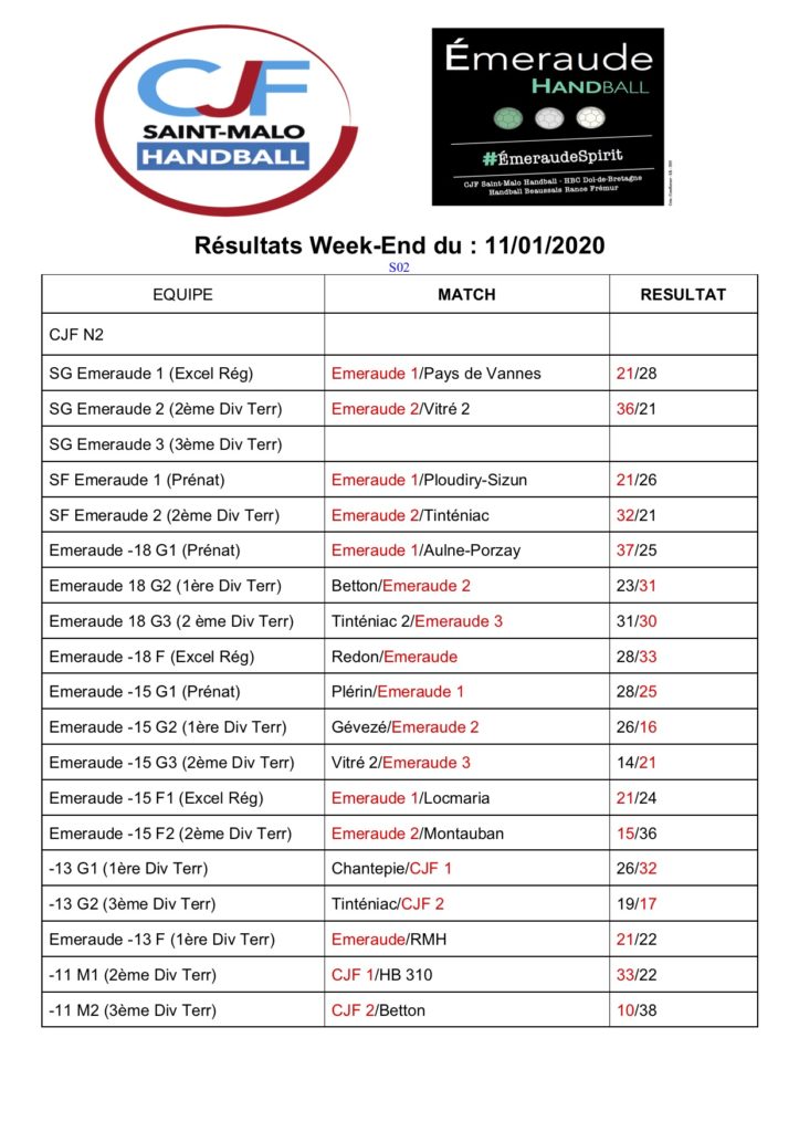 janvier1313 janvier 2020RÉSULTATS CJF SAINT-MALO et ÉMERAUDE HB – 11 & 12 JANVIER 2020By s.botzIn Résultats