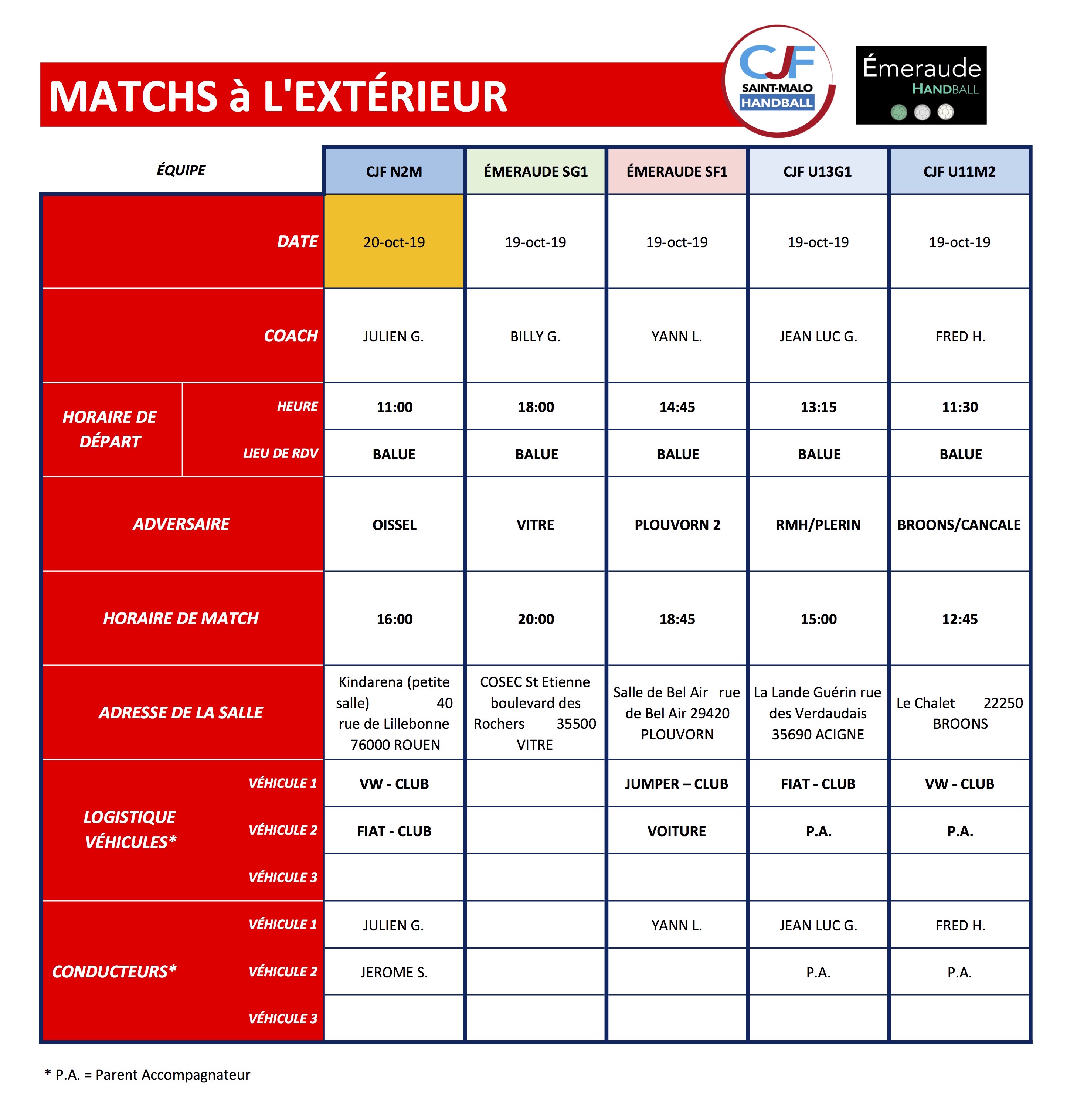 Quand les cases ne sont pas remplies, c’est que le club nécessite de parents accompagnateurs et de véhicule(s) pour assurer les transports. Rapprochez-vous du Coach responsable du collectif pour accompagner l’équipe de votre enfant.